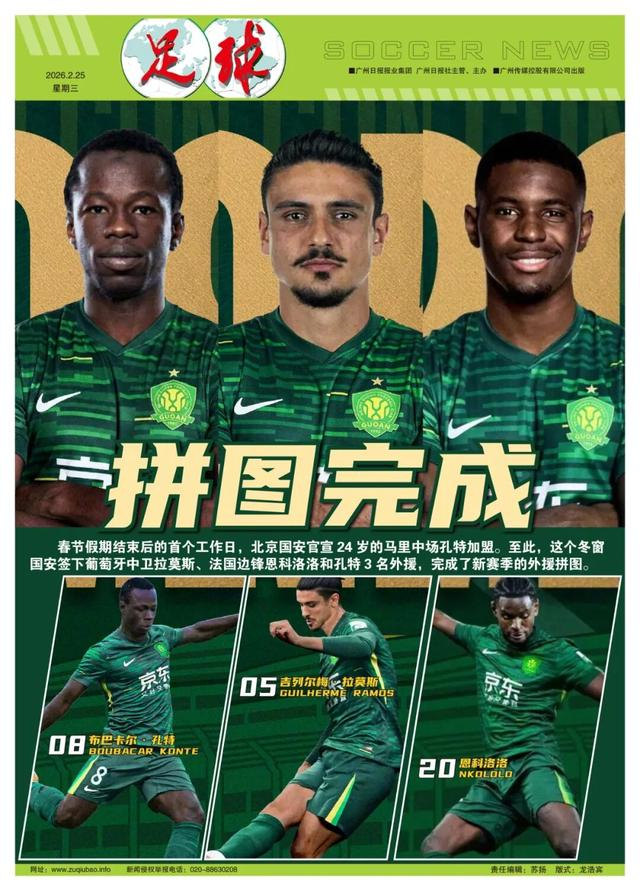 撰稿/程善 2月24日,春节假期结束后的首个工作日,北京国安官宣24岁的马里中场孔特加盟。至此,这个冬窗国安签下葡萄牙中卫拉莫斯、法国边锋恩科洛洛和孔特3名外援,完成了新赛季的外援拼图。值得一提的是,虽然官宣时间较晚,但孔特已抵达苏州随队训练,甚至参加了23日与辽宁铁人的热身赛。除了受伤的斯帕吉奇,国安其余5名外援均已全力备战3月1日与上海海港的超级杯比赛。